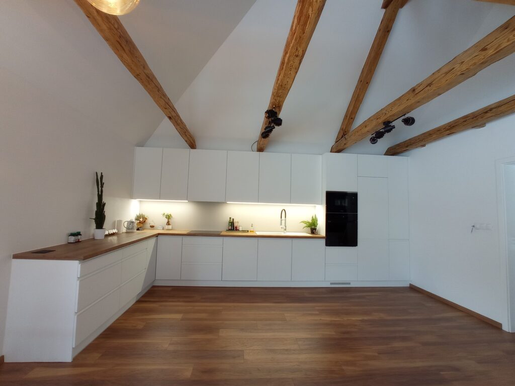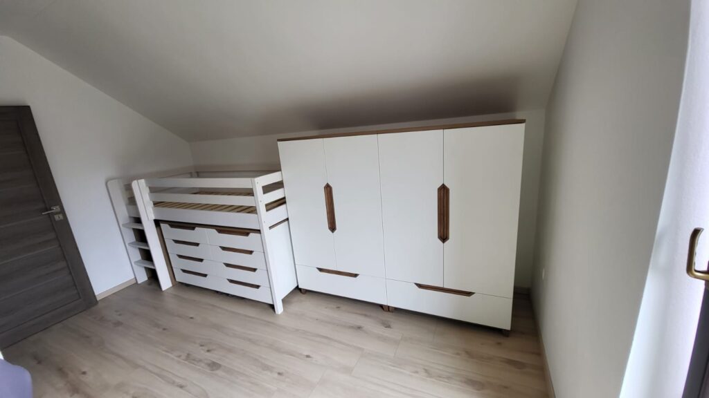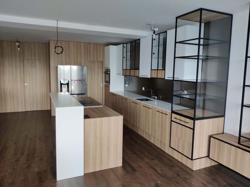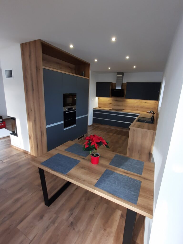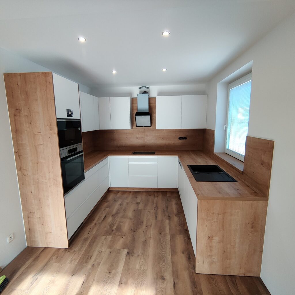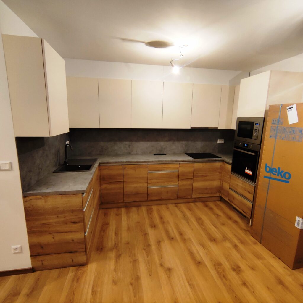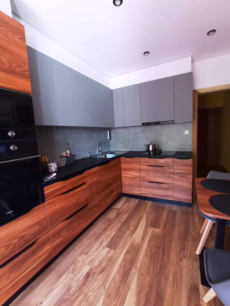 Materiál: Vrchné dvierka: Kaindl 2171 OM/PE sivá Spodné dvierka: Cleaf S016 Pracovná doska: compakt,